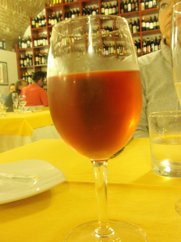 Cominciamo con gli antipasti (davvero gradevoli): 1) Tortino di asparagi e parmigiano, 2) involtino di verza con robiola di Roccaverano tartufata (appaganti); primo piatto: tajerin con carne e sugo di vitello arrosto; secondo: guanciotto di cavallo brasato al cioccolato fondente e barolo chinato (da catapultarsi). A tuttopasto, visto che siamo nell’osteria del barbera, un barbera riserva 2005. Che altro.